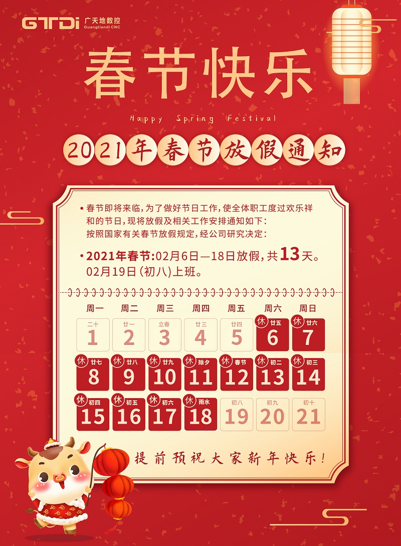 2021年春节将至,首先感谢您在2020年里的鼎力支持和愉快合作,PA娱乐数控全体同仁在此给您拜个早年。在新年的一年里,PA集团将更加努力,为您提供更优质的服务。按照国家春节放假规定结合我司的具体情况,春节放假时间安排如下: