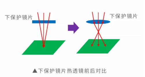 由于光学元件质量差、脏污、损坏等原因造成对激光吸收率增大,光学元件受激光束连续较长时间照射后,温度升高产生热变形,进而引起透过型光学元件的折射率和反射型光学元件的反射方向发生变化。热透镜效应会改变激光焦点(束腰)的位置,进而影响应用效果。
